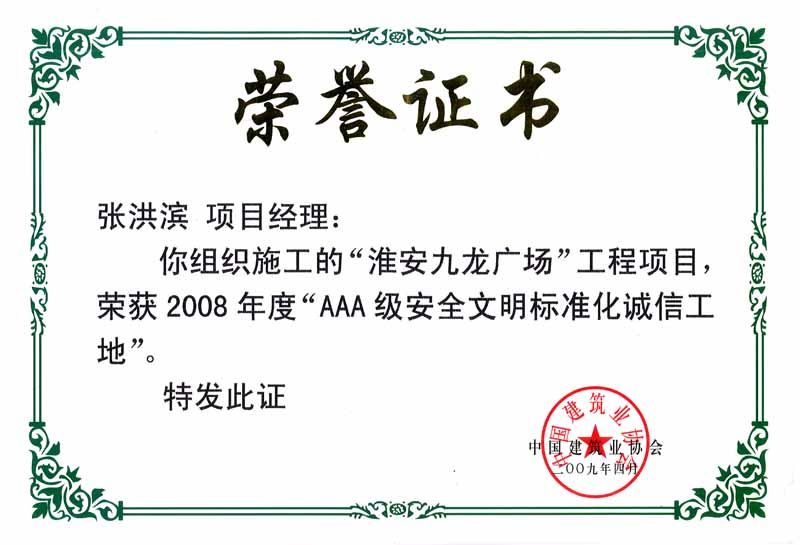 2009年AAA级安全文明标准化诚信工地-张洪滨