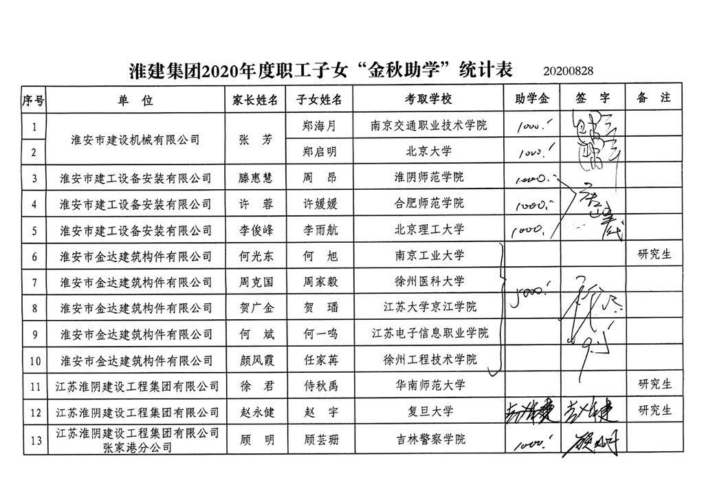 金秋助学,爱心圆梦。进入九月份,集团职工迎来收获的季节。集团工会组织的一年一度的“金秋助学”奖学金圆梦行动得到了职工的交口称赞。2020年,集团共有13名职工子女应届毕业考上高等院校,3名职工子女考上研究生。其中1名职工子女应届毕业考上北京大学,这也是既去年之后连续第二年集团职工子女应届毕业考上北京大学。受新冠肺炎疫情影响,这些莘莘学子开学时间各不一样,已各奔前途,踏上求学征程,集团没有集中举办奖学金发放仪式,而是将奖学金直接发放到学生家长手中,这些浓浓爱意如缕缕冬阳温暖了学生家长的心,得到了学生家长的一致好评。